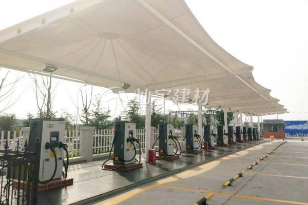 膜結構停車棚的篷布材質是膜結構,而膜材的最大特點是強度高、耐久性好、防火難燃、自潔性好,不受紫外線影響,